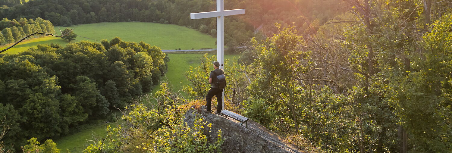 Ein Aussichtspunkt mit nahezu alpiner Anmutung. Das „Gipfelkreuz“ ragt aus meterhohem, schroffen Felsgestein. Ein wenig Mut brauchst Du schon, um über den senkrecht stehenden blanken Fels bis ans Kreuz zu gelangen und den weiten Blick in und über das Tal der Großen Nister zu erhaschen. Ein Ort für Momente, die es verdienen in einem Foto festgehalten zu werden. Dass auch der Westerwald-Steig die Hohe Ley passiert überrascht da nicht.
